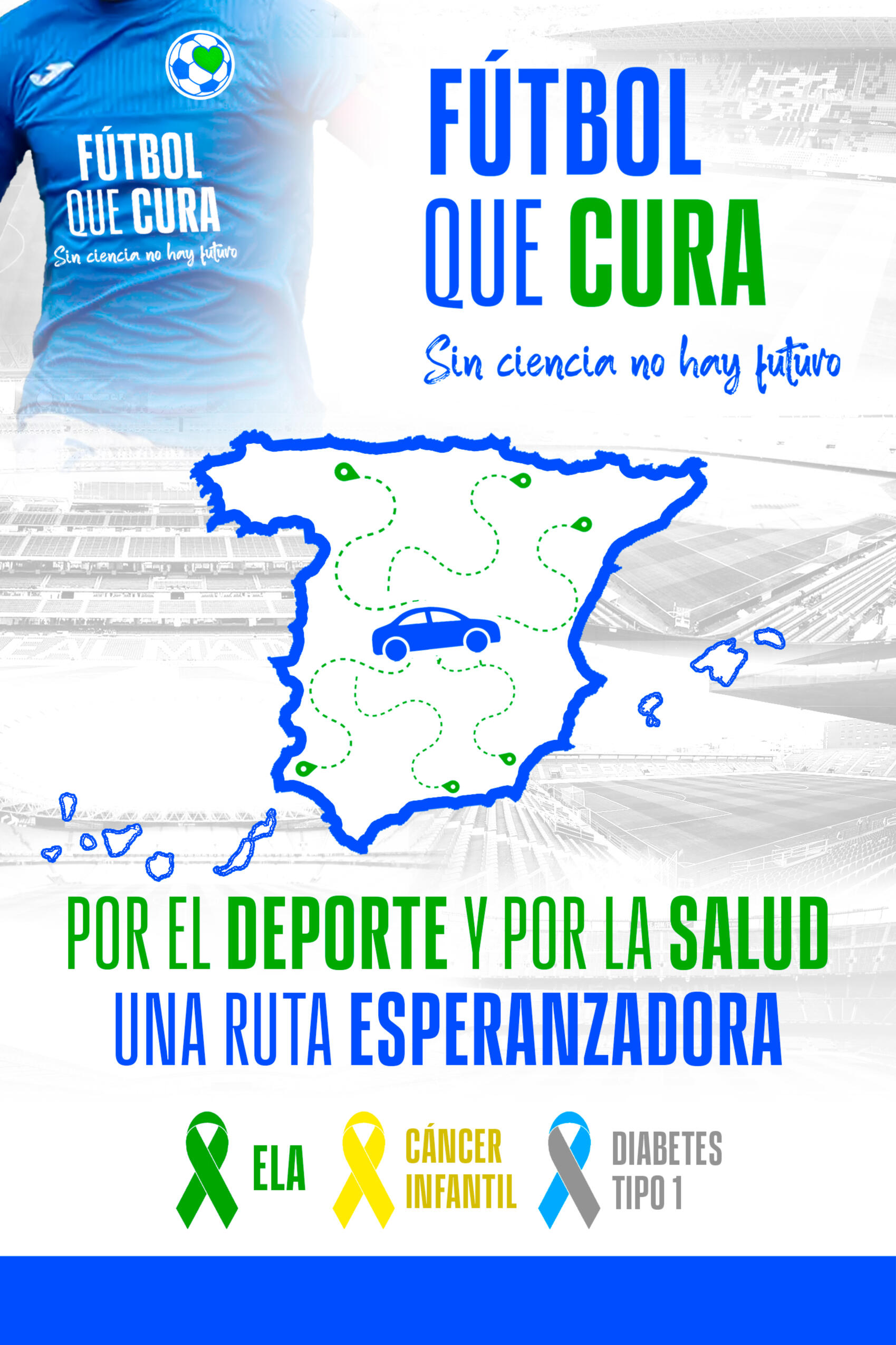 La ruta de Futbol Que Cura no es un recorrido cualquiera. Es un viaje solidario por todo el país, donde cada parada suma, cada club conecta, y cada kilómetro cuenta.El proyecto recorrerá distintas provincias de España, visitando clubes modestos que han decidido poner su camiseta al servicio de la ciencia y contando cada historia.En cada lugar, se entregan camisetas, se recogen otras, se graba una historia. Es una ruta en red, humana y horizontal.Esta ruta no sigue criterios geográficos perfectos ni lógicos de grandes eventos. Está pensada como un hilo emocional que cose el país desde lo invisible. Va de vestuario en vestuario, de campo en campo, de barrio en barrio. Donde hay humildad, hay valor. Y donde hay valor, hay ciencia.El recorrido se inicia en Ciudad Real, punto de partida simbólico del proyecto.Desde allí, viajaremos por distintas comunidades autónomas, conectando clubes que decidan apoyar la salud.
